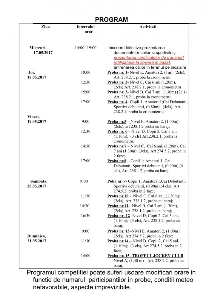 Competiția va culmina duminică, de la ora 14:00, cu proba „Trofeul Jockey Club”, devenită o tradiție la concursurile de la Equestria. Cu cel mai înalt grad de complexitate, proba va cuprinde înălțimea obstacolelor de 1,40 m și va avea cel mai mare coeficient în stabilirea clasamentului final din competiția pentru „Cupa Equestria”.