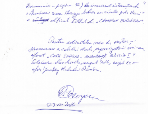 Pentru activitatea mea de creștere și promovare a calului arab, organizatorii mi-au oferit „Cupa Shaghya – Anduranță, Ediția I” Sălcioara Dâmbovița, august 2016, cupă ce o ofer Jockey Clubului Român.”